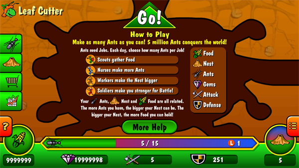 蚂蚁战争模拟器最新版是一款以蚂蚁为题材的模拟养成游戏,模拟游戏大多数都是模拟超市、餐馆经营之类的,但是这款游戏并不一样,模拟的是战争。在游戏里玩家需要管理一个小的蚂蚁农场,然后不断发展,构建一个蚂蚁帝国,在这个过程中你会遇到敌人的入侵,你需要升级训练自己蚂蚁士兵的技能击败敌人守护自己的家园,不断的扩大自己的蚂蚁巢,从而来获得更多的食物。并且在蚂蚁战争游戏中有四种不同的蚂蚁,每一种蚂蚁的分工不一样,玩家需要好好利用哦!不仅如此,游戏最有趣的一个地方在于可以观看地上和地下场景,在地下场景可以扩展地盘,繁殖蚂蚁,在地上场景可以收集食物同时攻击敌人,对手速的要求还是有一点的。另外,不要看游戏体积小,但画面表现的蚂蚁和各种战斗装置还是十分清晰、逼真的,游戏卡片的图片绘制也十分精美,背景音乐的节奏也很不错,给人一种置身昆虫世界的感觉,整体表现得很有特色。