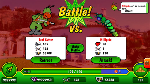 5、当然这里也不是一帆风顺的,在这个过程中你会遇到敌人的入侵,你需要升级训练自己蚂蚁士兵的技能击败敌人守护自己的家园;