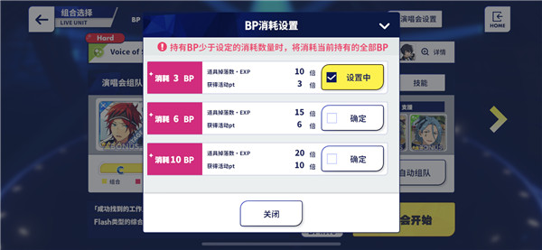 消耗BP调整:可以调整歌曲的BP消耗,BP消耗越多,单次收益越多。当BP为0时也可以进行演唱会。