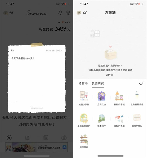 Sumone安卓版相比其他同类软件而言,不仅拥有大量的道具、家饰品可以使用,还可以记录你们相爱的日期、常问的问题等等。并且,Sumone最大的一个特色就是,可以通过两个人的血型领取一个小宝梦,最后还可以生出熊猫,小狗等四种小动物哦?整体画风可爱但不幼稚,充满了爱的气息,用完之后感觉恋爱都更甜了,感兴趣的朋友快来下载试试吧!