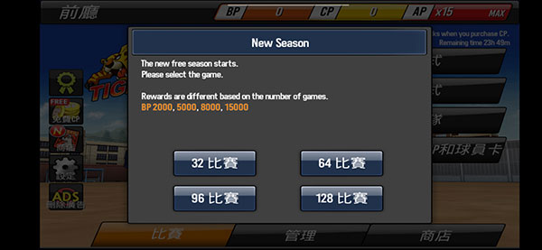 1)联赛模式- 用你想要的游戏数量组成赛季。(16、32、64、128场)