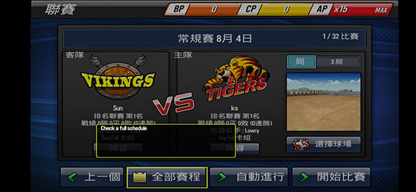 7、来到联赛界面,可以查看全部赛程、点击自动进行,直接完成,点击开始比赛进入比赛界面。