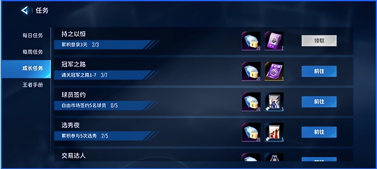 成长系统是类似与成就的终身系统,每个任务可以完成一次,达到不同阶段的成就和目标可以获得对应奖励,球员招募券、教练碎片、展品碎片等道具应有尽有,也是攒绑钻的渠道之一,很多养成系经理人以完成成长任务为游戏目标。