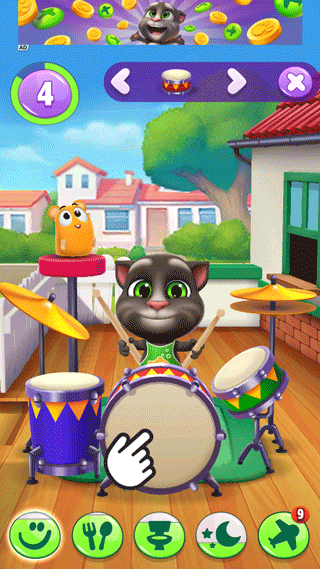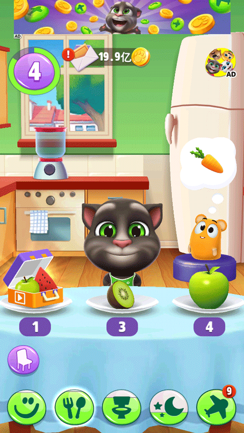 1、下方对应的四个四个区域对应汤姆猫的各种养成玩法,有开心程度,饥饿程度,精神程度,干净程度,需要如果数值变低,汤姆猫的心情也会变化。
