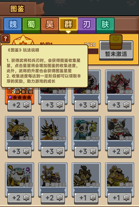2、玩家可以通过图鉴查看武将信息,解锁武将还能获取星星,收集星星可以获取丰富的奖励。