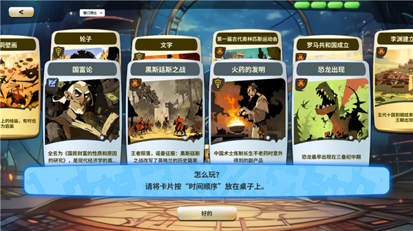 玩法非常简单,排序错误会扣分,排序准确且用光了手牌可就通关。《时光探戈:哪年来着》整体游戏内容包含了历史中非常多简单事件,这不仅仅考验玩家是否拥有一定的历史知识储备,还将带领大家拉回历史当中,你会发现,原来诺基亚公司与江南制造总局是在同一时期建立的,甚至还可以想象与汤显祖和莎士比亚同时追看彼此的作品,感受不同时代的风貌,以及其中有趣的历史故事!