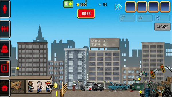 3、操作之后自然就是游戏的玩法了。刚进入游戏时我们只有一人一枪,通过击杀僵尸来获得金币,金币可以用来升级我们的角色,营地,还有解锁同伴,游戏中当我们击杀足够多的僵尸时,就会出现召唤boss选项,当你觉得自己足够强大时,就可以点击屏幕上方的boss图标召唤boss出来,击杀boss之后我们就会直接进入到第二天。而我们的目的就是击杀所有来犯的僵尸,支撑到100天。游戏一开始击杀僵尸还是非常轻松的,但是千万不要因此小看了boss的实力,在你实力不够强大之前,尽量还是不要召唤boss。