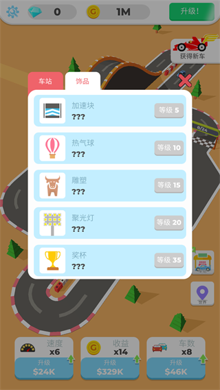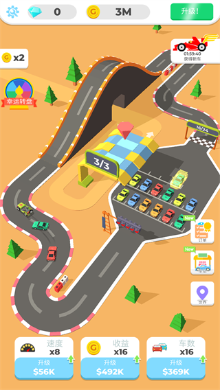 3、各种各样的赛车,不断的进行融合即可,让你的最高级赛车跑圈来赚金币。