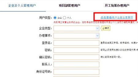 3、可以选择企业及个人管理用户、项目部管理用户、开工统筹办理用户、住建领域信用系统账户,大家可以根据自己的需求进行选择;