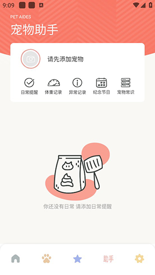 用户点击下发铃铛图标即可进入助手页面,点击可以添加宠物,可以记录宠物的体重、异常等,还可以查看宠物常识。