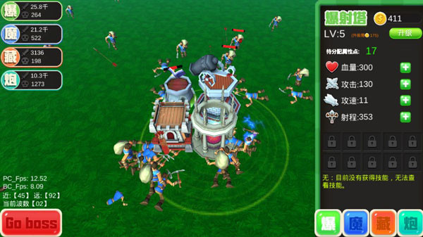 爆塔:boss输出主力塔,伤害成长高,虽然射速成长低,但基本就打boss和补小兵,boss关怪物一拥而上,感觉点射程作用不是很大,个人推荐点伤害射速,伤害点到能秒小兵就行