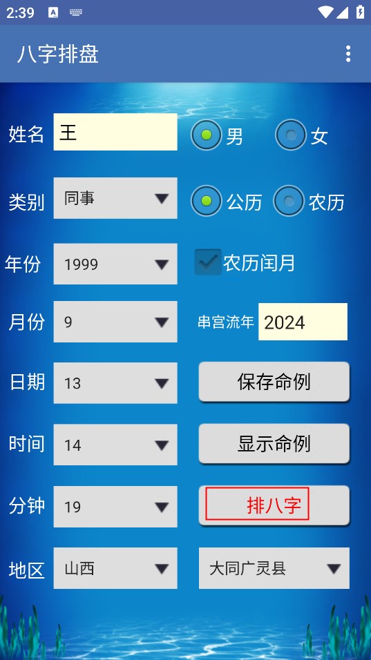 1、在本站下载八字排盘app后,输入和选择好各个数据;
