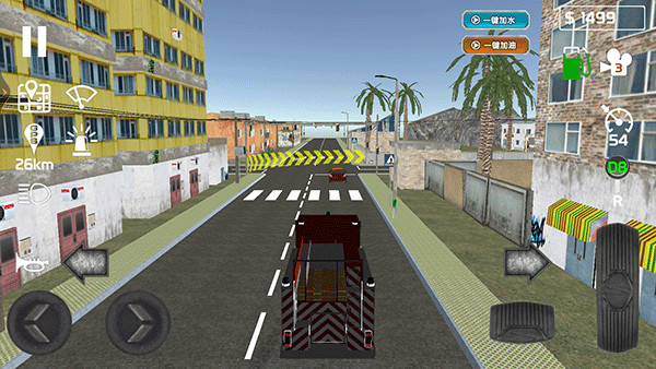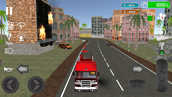 1、点击方向盘驾驶消防车,操作手感逼真,驾驶消防车巡逻,体验消防员默默守护城市的工作。2、无游戏剧情,3D城市随时发生火灾,及时到达现场,控制火灾,确保救出更多的无辜者,减少伤亡。