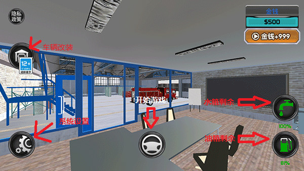 1、进入游戏,首先是一个在消防队的画面,左上角是改装自己的消防车,左下角是系统设置,右边绿色按钮分别对应的是水箱里的水和消防车的油量,当水和油用完后需要及时补充,否则消防车辆无法灭火和行驶。点击屏幕中间的方向盘进入任务模式,就可以开始驾驶消防车去灭火啦。