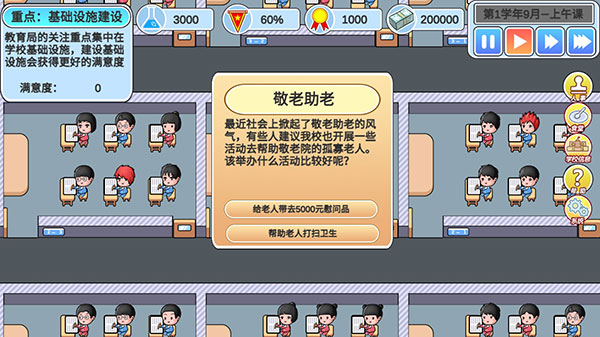 一个好的校长会根据每一个学生的性格和天赋决定他们的教学方式。学生是学习文科还是理科,是分入重点班还是普通班。是否把差生集中到放羊班,还是有教无类。这些都将由玩家自己决定。