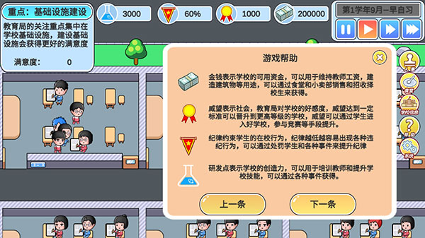 3、游戏开始之后,会有这个贴心的小帮助,让玩家可以更好的管理学校。