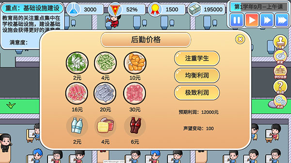 在游戏中,玩家可以管理教师和学生的课程,利用复读生和销售可以获得更多利润,任命教导主任和学生会成员来辅助管理学校,自由安排分班,通过分配文理科和重点班来优化教学资源。与其他同类型游戏不相同的是,游戏在经营模拟中添加了卡牌系统,玩家可以利用各种卡牌来达成不同效果,例如:可以使用义务劳动卡牌来降低学校建设成本,贿赂裁判卡可以在在各种竞赛中取胜,合理的利用卡牌会让你在游戏中事半功倍。