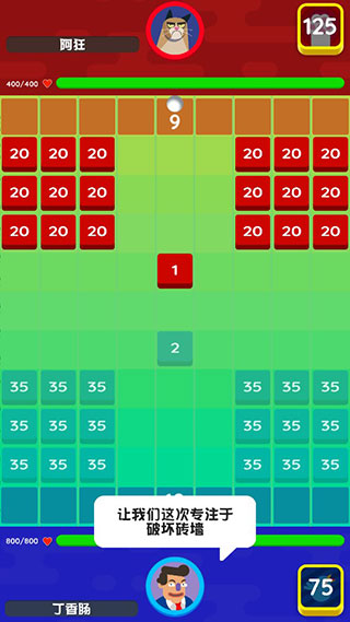 线上1V1模式,在线匹配你的对手,你来我往的小球射击,眼前的砖块是阻止你胜利的障碍,消灭它,打倒敌人。在pvp模式中,每个人物还拥有着专属技能,释放你的专属技能加快打击砖块的力度!注意:当对手的“砖块墙”与玩家自己的“砖块墙”相撞时,会抵消(相减)两块“砖块墙”上面的数字,当砖块数字为0时,该砖块将消失。