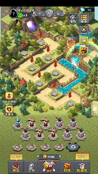 2、购买好的防御塔会出现在下方的统一的生成区域,同类且同等级的防御塔可以进行合成。