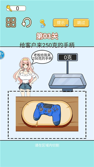 比如在关卡的第一关,玩家需要按照顾客的要求将手机切出35克,多了顾客是不接受的,这个时候一刀下去没切到35克,不管是多了还是少了都要重新切,直到达到35克就可以通过,然后进入到下一关。