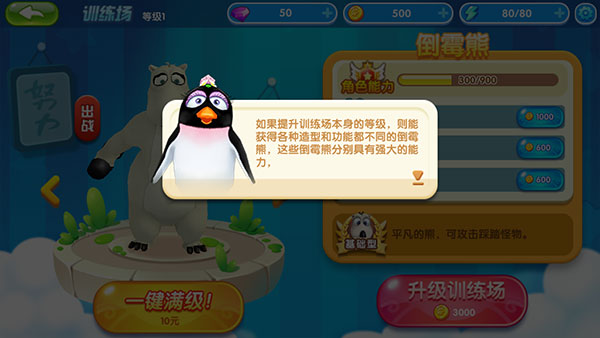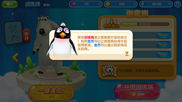 2、原来训练场是让倒霉熊升级的地方,利用金币可以让倒霉熊自身升级变得更强,金币可以通过购买或闯关获得。