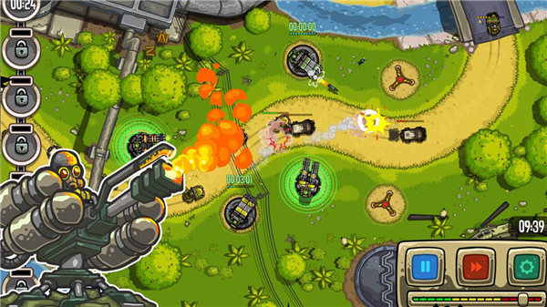 总体来说,游戏还是遵循经典的塔防游戏规则,还是一日既往的以防御敌军的入侵为目标,但与之不同的则是这里采用更加贴合的现代战争技术精心打造,虽说玩法上并没有什么突出,但在特效的制作上可谓非常的良心,就拿防御的工程来说,机枪扫射非常逼真,而且还是自动瞄准的,火力全开的导弹炸裂效果都可谓非常的震撼,而玩家只需要通过建造、升级相应的设施即可,但值得说明的是升级需要一定的缓冲时间,在这个时间段不能进行攻击,也是你最值得注意的地方,往往这都是敌人逃脱的空隙。