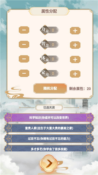 5、分配你的基础属性点,要是不想自己规划也可以点击随机分配,分配好了就点下一步开始你的修仙之旅吧。
