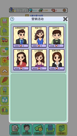 调整好之后,开始动工,然后在营销里面,点击秘书及鼓励师,确保2次以上的建造速度×4。在房子快建造的时候,招2个专家级销售(利用钻石解锁销售空位),再从营销里面观看3次以上的金牌销售,这样可以确保资金快速回笼(注意:当钻石足够时 多解锁建造师及销售员空位,可提高建造速度及销售速度)这样基本上就开始赚钱了!