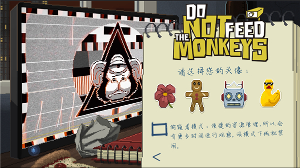不要喂猴子完整版是一款根据stme同名端游移植而来的一款带着大量Rougelike元素的游戏。在游戏中玩家扮演的是一个阿宅,在阿宅的世界中有这么一个组织——灵长类动物观察俱乐部,他们通过侵入各户人家的摄像头观察、记录他人的生活,以此获得他们需要的信息,并且通过这些手段获利或是达成某种目的。他们把每个被侵入的摄像头称为笼子,而“笼子”里的人,则被亲切的称呼为——猴子。在加入俱乐部伊始会给与你4个随机笼子,而每隔5天给予你的晋级指标(不满足就会被踢出俱乐部,GAME OVER)会需求你必须不断地购入笼子,直到满足最终需求的25个,而我们的主角,便是一个初出茅庐的俱乐部成员。