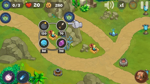 4、你能看到弓箭、符石以及炸弹等四种塔防类型,不同塔防所需消耗的资源各有不同,让我们从最基础的开始建造。