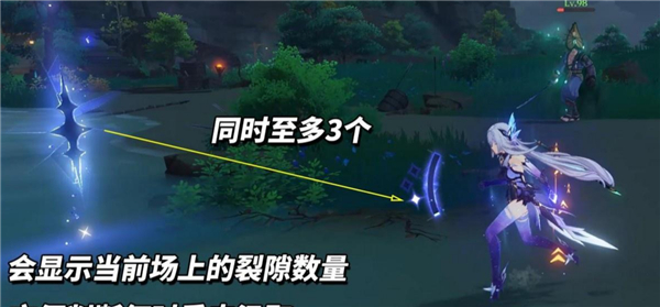 角色旁会显示当前场上虚境裂隙数量,满3个时重击回收,可延长变身时间。