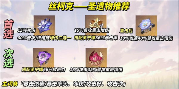 主词条「暴击伤害/暴击率头、冰伤/攻击杯、攻击沙」,副词条「暴击率、暴击伤害、攻击力」。在队伍搭配芙宁娜时,攻击杯与冰伤杯差距小,其余情况下同词条优先考虑冰伤杯。