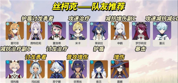 水冰队友能够给丝柯克提供普通攻击、元素爆发的独立乘区增幅,提升值远超其他元素。在无高命甚至满命其他副C的情况下,建议队伍全由水冰元素构成。