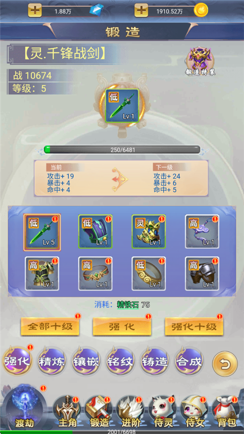 玩家可对各装备进行锻造、强化升级,提升攻击、暴击、命中等属性。