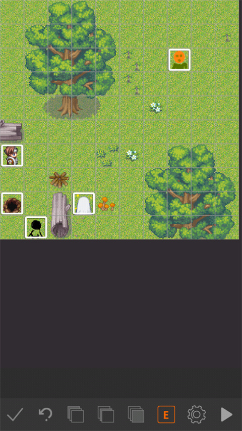 软件里有很多素材,比如帐篷、树木、花草和地块等,还有草地、树林、雪地三种地图背景。你可以直接在预设的地图上编辑这些素材,也可以新建地图开始全新的创作。