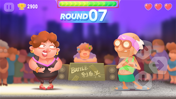尬舞之王是一款音乐和舞蹈于一体的娱乐休闲手游。游戏中玩家将扮演老太太或者老爷爷通过根据游戏中的人物给出的动作来进行模仿,从而为玩家一展优美的舞姿。尬舞之王游戏中具有联网对战和单人挑战模式,单人挑战里面有三个选项,简单难度、大师难度、反向挑战,反向挑战的意思是人物往左跳,玩家就往右跳,有时候左边会出现两个人,他们的动作是合起来的,玩家需要流畅模仿完,错了将扣除一颗爱心,游戏每局具有3颗爱心,如果连续模仿成功,还可以增加爱心。