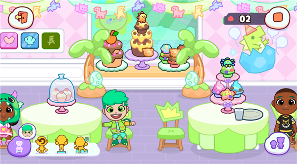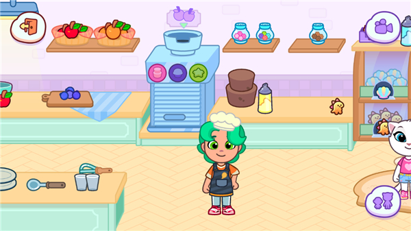在蛋糕店,你可以给角色换衣服、化妆,或者制作美味的蛋糕。点击角色还能使用表情包,让游戏更有趣。