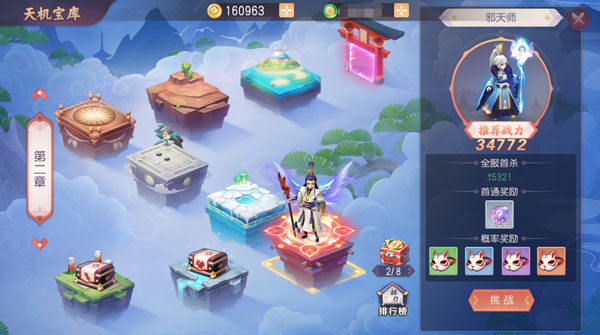 1、天机宝库全天开放,等级限制为30级,只能单人挑战。玩家需要通过天机宝库的关卡获得奖励,根据装备的等级分不同章节,章节随着等级开放,各个等级的玩家都可以获得与自己实力相匹配的极品装备。