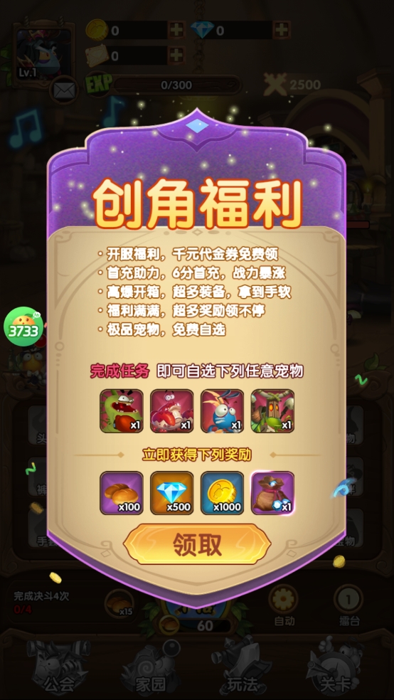 创角即送钻石、代金券、完成任务领极品宠物自选。