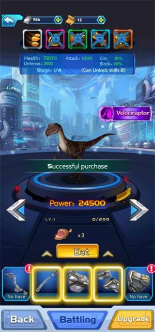 游戏里有各种关卡挑战,完成关卡可以获得奖励,用这些奖励购买更多的恐龙蛋或者装备。每只恐龙都有独特的技能,合理使用这些技能能让战斗更轻松。