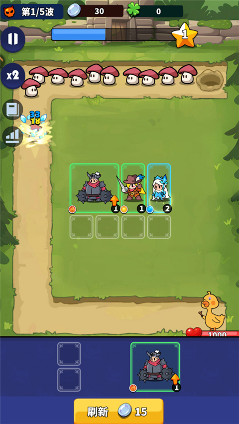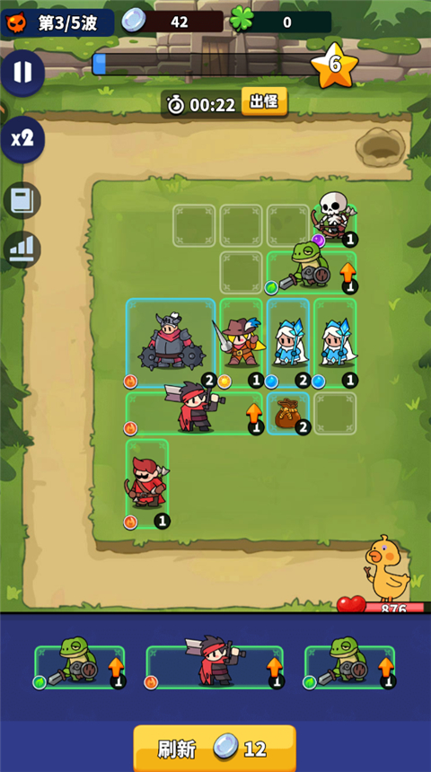 在游戏过程中,玩家可以通过合成升级角色,增强战斗力。每波战斗胜利后可以解锁一个技能,完成关卡或小鸡生命耗尽时会获得奖励,这些资源可以帮助强化角色等级和星级,进一步提升能力。