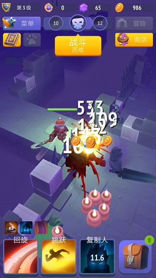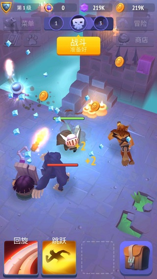 新手攻略: 刚进入游戏后,玩家会一直战斗并不断闯关。游戏操作非常简单,基本是自动攻击和释放技能。新人玩家一开始会有两个技能:回旋和跳跃。