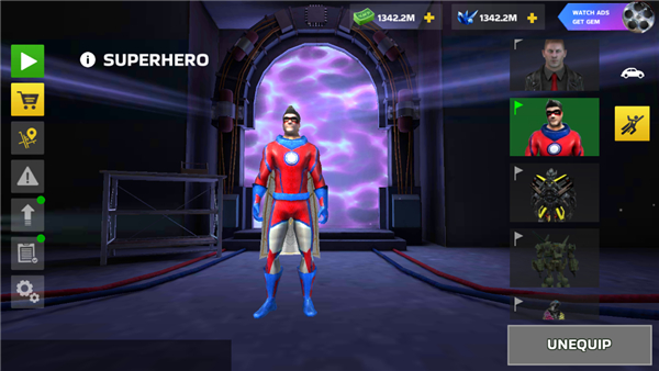 - 丰富的皮肤和装备:购买各种超级英雄皮肤、武器、装甲和其他配件。你可以选择最快的汽车、装甲SUV、飞机、坦克甚至战斗机器人作为座驾。