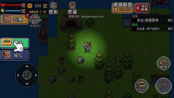 - 你需要集齐9颗宝石为飞船充能。在探索地下迷宫前,记得先补充能量。游戏中会随机出现食物(如胡萝卜),采集后自动加入背包。打开背包使用食物补充体力。