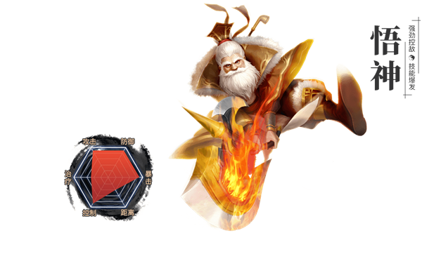 悟神修炼金属性的内功,手持一把巨斧,舞动起来十分威武。技能既有可使敌人无法行动的强控,也有降低对方移动速度的软控制,同时秒杀和普攻可以溅射,让悟神在遭遇多个敌人时,可以轻松解决。另外逆脉入魂的技能可以瞬间提高悟神的爆发性,在战斗的搏杀中取得优势在具备极强生存能力的同时,也拥有着不俗的伤害和控制能力。