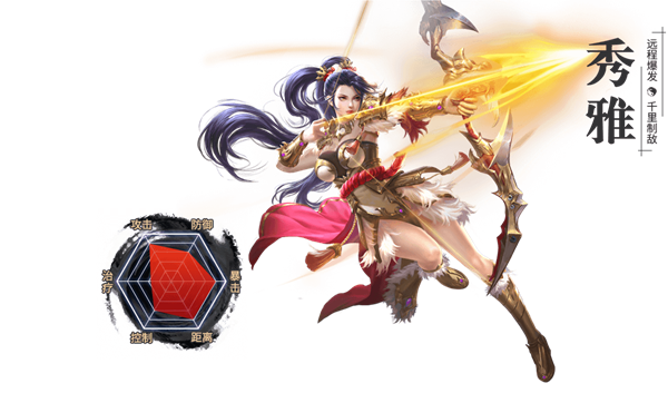 秀雅属于远程职业,她修炼火属性的内功,使用一弯长弓作为武器,每次攻击都将给敌人带来最沉痛的打击。高护盾和强晕眩,让她在PK或副本中都能游刃有余。当然,其姣好的面容也一定是吸引许多玩家选择她的原因之一。