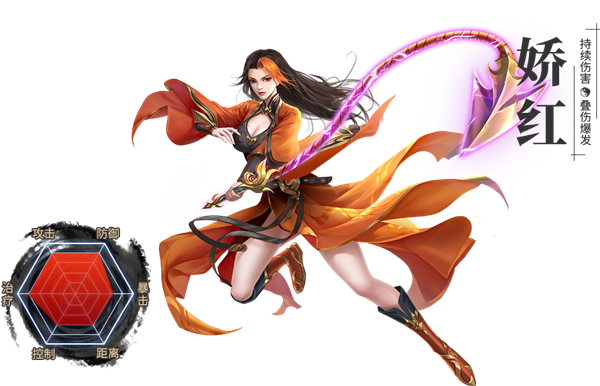 - 娇红:火属性内功,使用长鞭战斗。拥有持续伤害、控制、免伤等多种技能机制。