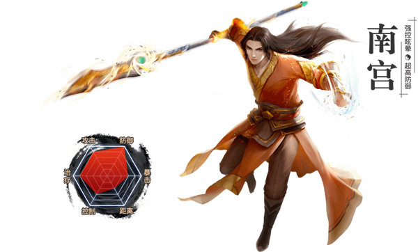 南宫手持一把大刀,修炼土属性的内功。在具备极强生存能力的同时,也拥有着不俗的伤害和控制能力。