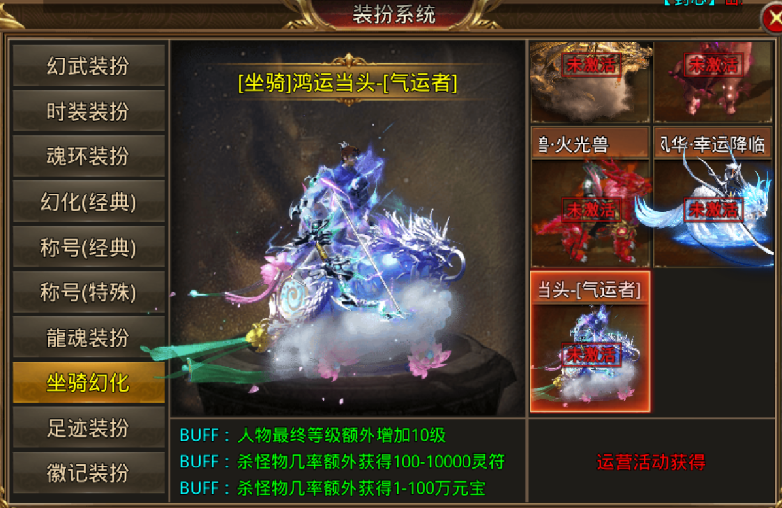 装扮系统:游戏中有很多丰富的装扮选项,包括幻武、时装、魂环、称号、坐骑和足迹等。每个品类都有多种款式选择,总能找到你喜欢的风格。