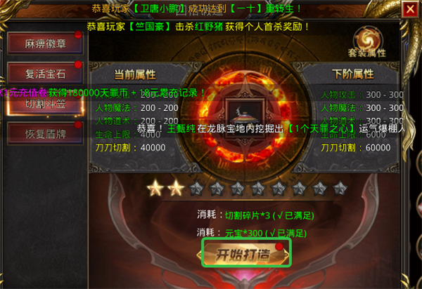 4、玩家拥有足够切割碎片以及元宝就可开始打造,提升战斗力。